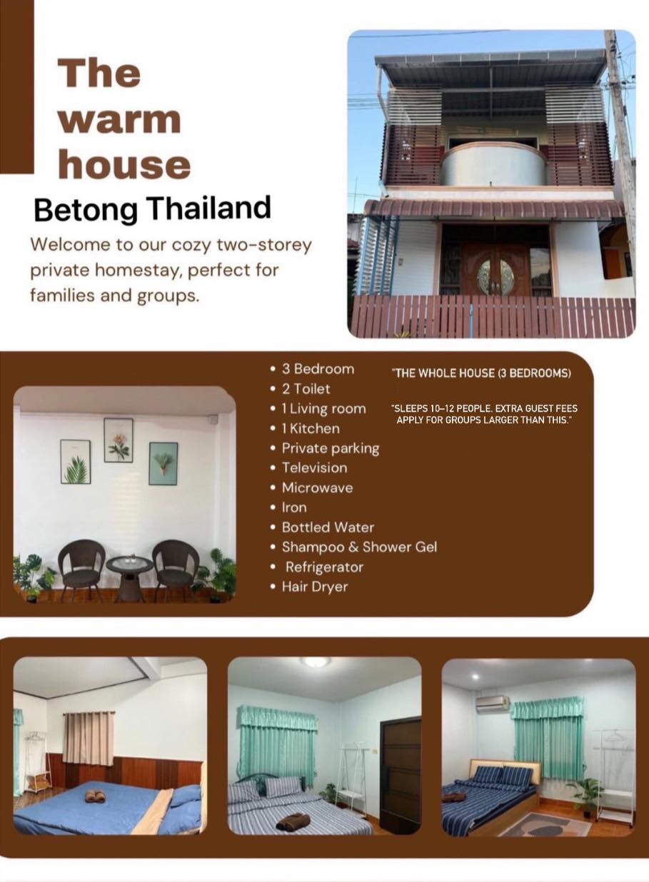 Meilleur séjour à Betong pour les familles et les groupes 🏡 Rainhill @ Betong – Maison populaire dans le centre de Betong Maison spacieuse de 2 étages près des attractions Peut accueillir jusqu'à 11 personnes : idéal pour les familles et les groupes d'amis Vue sur la montagne, air frais, ambiance paisible Très propre, lits confortables, climatisation dans toutes les chambres Cuisine complète, grande table à manger, collations et eau gratuites Stationnement pour plus de 3 voitures Wi-Fi et Netflix gratuits Sécurisé avec vidéosurveillance et serrure numérique Lorsque vous visitez Betong, faites de Rainhill @ Betong votre maison loin de chez vous!