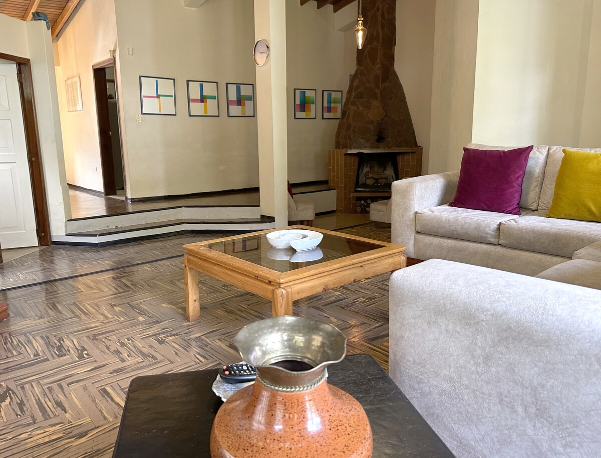 Vivez des expériences inoubliables avec votre famille et votre groupe d'amis dans cette maison spectaculaire entourée de jardins dans la paix et la sécurité, totalement indépendante meublée et équipée. Il dispose de 3 chambres avec salle de bain privée + 1 chambre supplémentaire. Salon, salle à manger, cuisine, salle de bain sociale, cheminée, smartv, balcon avec hamac, garage privé pour 2 voitures. Wi-fi, internet, eau chaude (24 h/24) Espace pelouse avec accès pour les enfants. Lits : 5 (lits queen : 3, lit double : 1, lits jumeaux : 1, canapé-lit : 1) Capacité : 9 personnes.