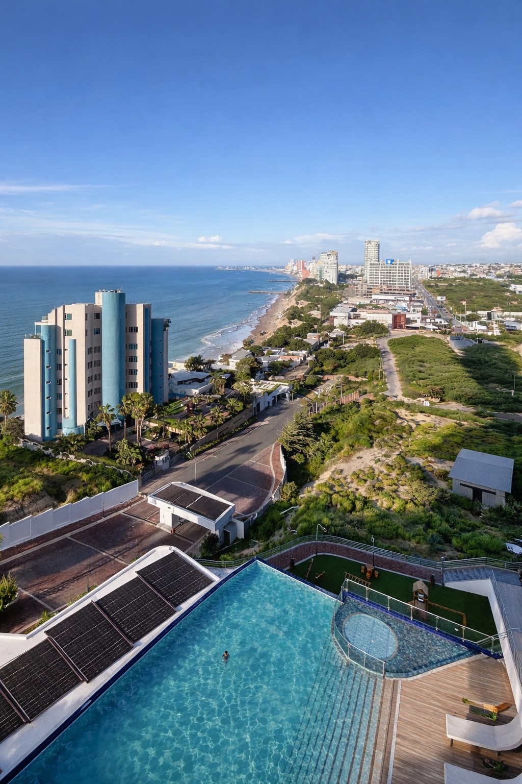 Profitez de Manta depuis un emplacement privilégié à Playa Murciélago. Appartement moderne en deuxième ligne de mer, à seulement 2 minutes à pied du Mall del Pacífico, des restaurants et de la promenade. Détendez-vous dans la piscine, le jacuzzi ou le sauna après une journée à la plage. Il dispose d'un balcon avec vue sur la mer, d'une sécurité 24h/24 et 7j/7 et d'un accès facile à tout sans véhicule. Idéal pour les couples, les voyageurs d'affaires ou les escapades de détente en bord de mer.