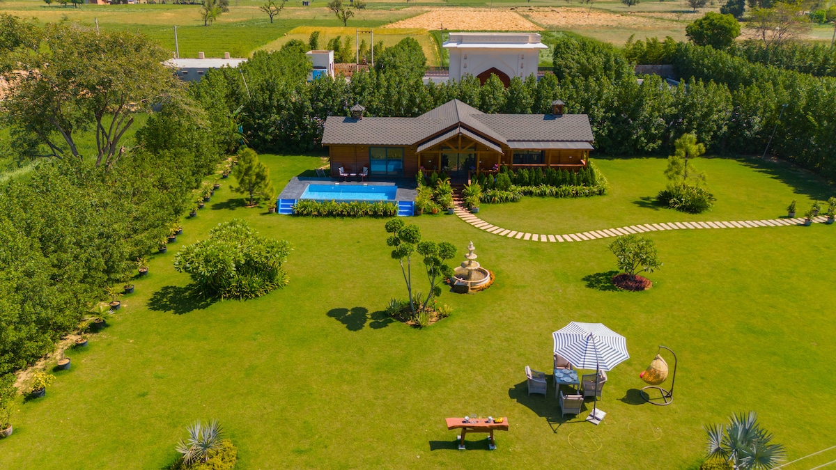 ◆ With hill views as a backdrop, discover a 3-BHK farmhouse in a picturesque setting, surrounded by lush greenery. ◆ Step through the grand Mughal-style gateway into a vast garden with a bonfire setup, perfect for unwinding under the open sky. ◆ The sparkling pool offers a serene escape, while the warm wooden interiors in the living area frame stunning outdoor views.
