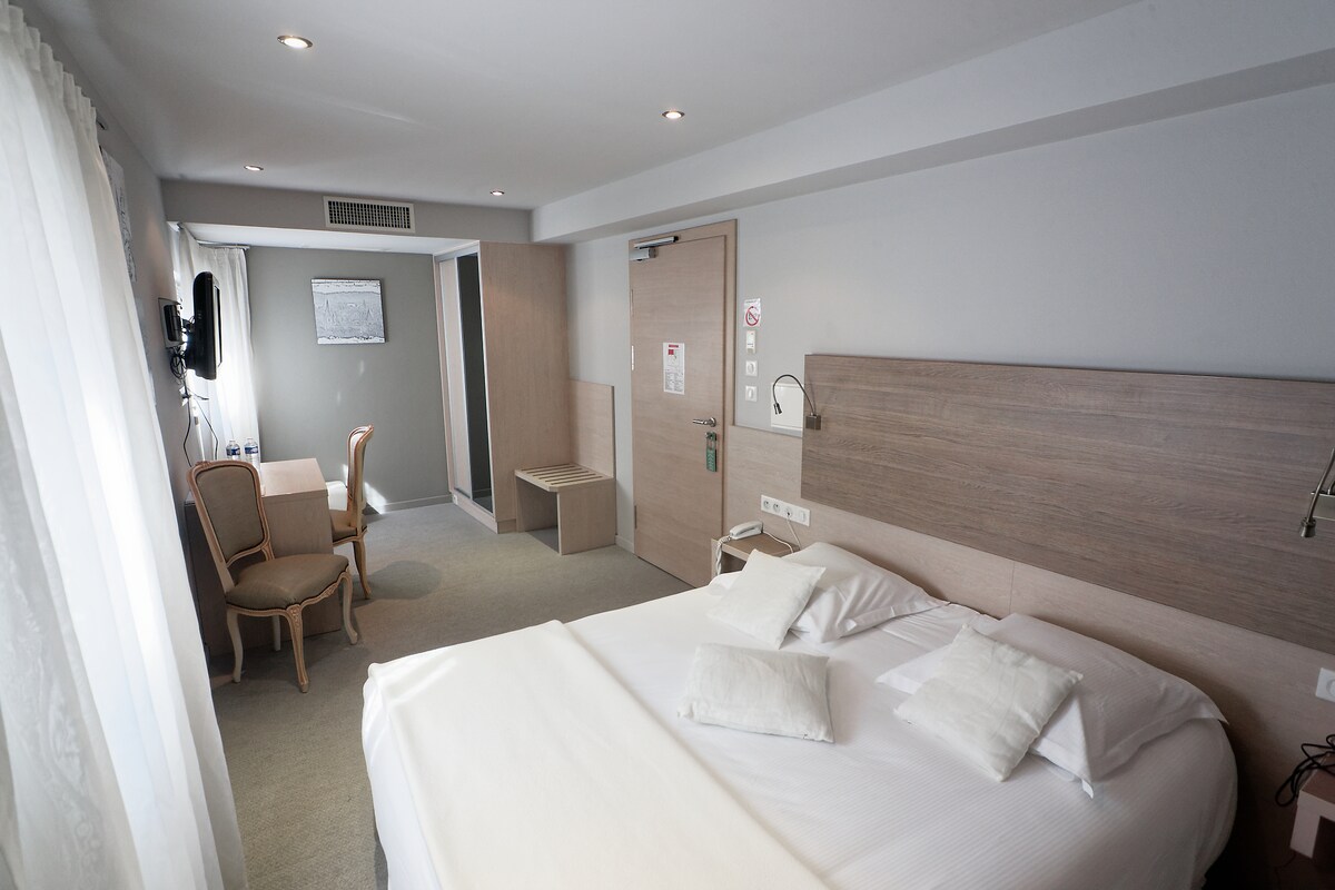 Chambre climatisée pour 1 à 3 personnes, située dans la nouvelle aile de l’hôtel, équipée d’un grand lit double (180x200) et d'un lit simple (90x190) , avec téléviseur à écran plat (46 pouces), WIFI et connexion internet filaire gratuits, une salle de bain privative avec douche à l’italienne (sèche-cheveux, miroir grossissant) et toilettes séparées. Cette chambre est également équipée d’un coffre-fort et d’une machine à café Nespresso.