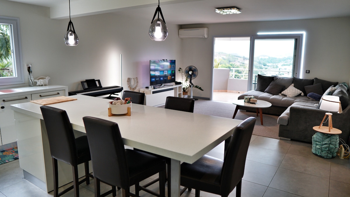 Sur les hauteurs d'un lotissement résidentiel à 4 km de la ville de Nouméa et à 3 km du Golf International de Tina, ce logement neuf est entièrement équipé pour accueillir une famille avec 2 enfants ou 2 couples. Attention, les fêtes avec nuisances sonores de jour comme de nuit sont strictement interdites durant le séjour pour le bien être de tous le monde