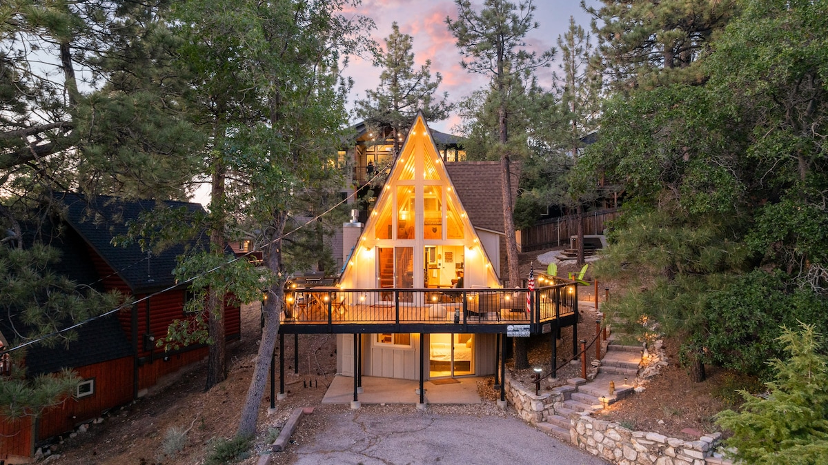 . Stunning sunsets from the deck . Walking distance to the Big Bear Mountain Resort . Pets welcome . Fully Equipped Kitchen w/high end Smeg + Hallman Appliances . A-Frame + Open Concept Lounge/Dining/Kitchen . Large Furnished Main Deck w/ Stunning Lake +Forest Views . Movie Room w/high-resolution projector . BBQ/Grill . Hiking Trails right outside our doorstep . High-speed Wi-Fi + Workspace . Central Heating + 4 Fireplaces . Hot Tub on a covered Deck offering Privacy + Scenic Views Year-Round!