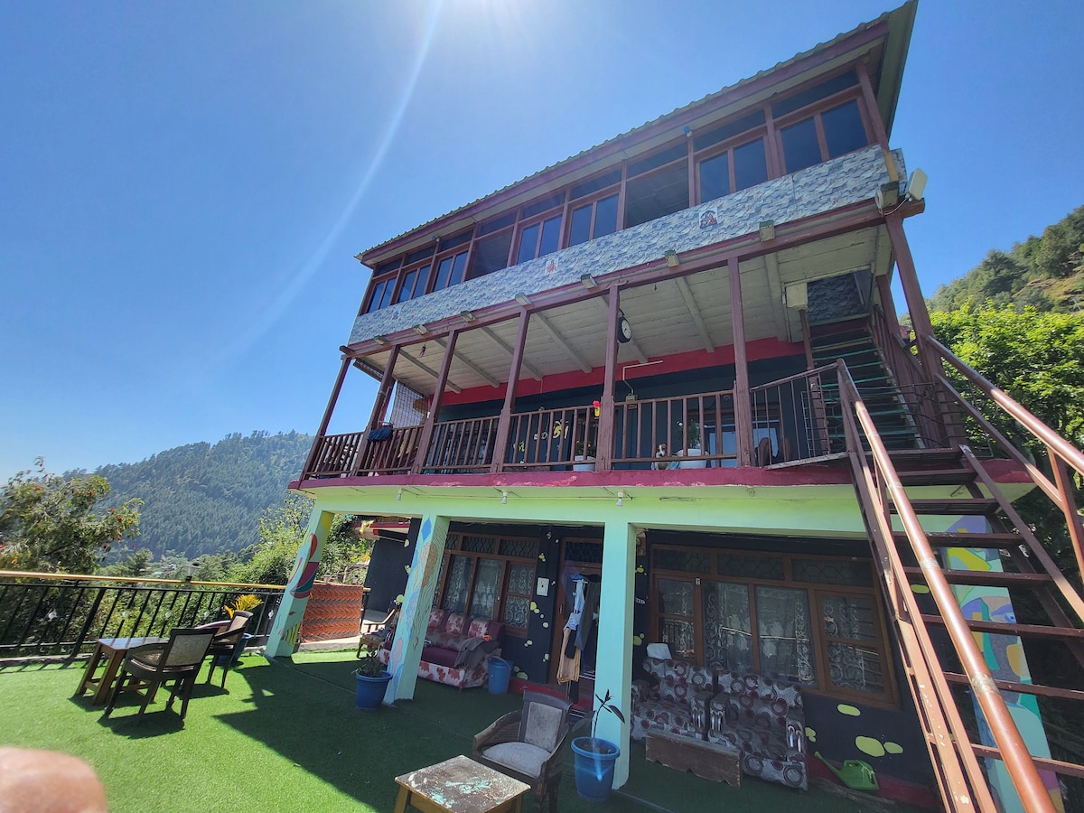 « Iris Cottage and Cafe - Manali » ✓ 3 chambres avec salle de bain attenante avec geyser + coin repas/salon privé + un balcon privé, ✔ À environ 1 km de Mall Road et des sources chaudes de Vashisht ✔ parking pour 6 à 7 voitures ✔ wi-fi service de ✔ chambre et entretien ménager ✔ café/ salle à manger maison avec diffusion en direct sportive + musique ✔ bouilloire, café/ thé dans la chambre ✔ propriété entourée d'Apple Orchard hôtes ✔ expérimentés pour vous aider avec les visites/ activités/ taxi/ itinéraire coût supplémentaire : + chauffage d'appoint, feu de camp