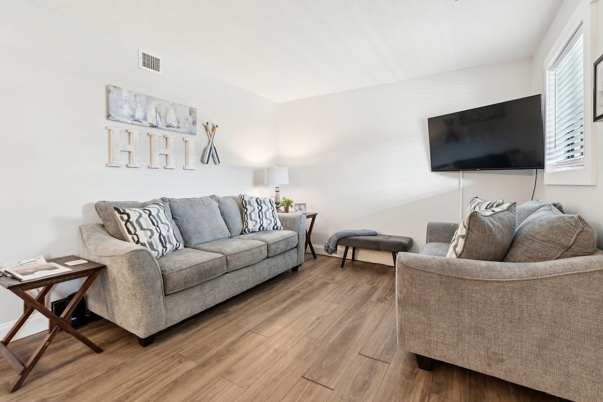 Nouvellement rénové l'année dernière ! Adorable appartement en bord de mer situé dans le complexe HH Beach & Tennis Resort. Regardez et écoute les vagues de l'océan depuis votre balcon au 2e étage ! L'appartement se trouve dans une zone fermée où les voyageurs auront accès à une plage privée, 2 piscines, des restaurants de villégiature, du tennis, du pickleball, du beach-volley, des aires de jeux, des zones de cuisson, des locations de vélos et une salle de sport. Nous fournissons également des chaises de plage, des glacières, des boogie boards et du café ! Tout est là ! L'escapade que vous attendiez et méritez !