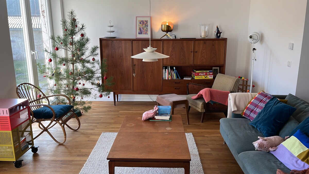 La ferme à quatre côtés de 1890 sert toujours de ferme. Seul le bâtiment résidentiel côté rue est utilisé pour l'habitation. Nos appartements d'hôtes à l'étage doivent maintenant créer l'équilibre entre l'ancien et le nouveau. Regardez aussi les autres : https://air.tl/wPr3xWOl https://abnb.me/ZzpYQubi9eb Il y a certainement encore beaucoup à faire, mais je vois cela comme un travail de toute une vie. Mais beaucoup de choses ont été conservées. Nous vivons donc toujours en bas avec les mêmes meubles que mes arrière-grands-parents.