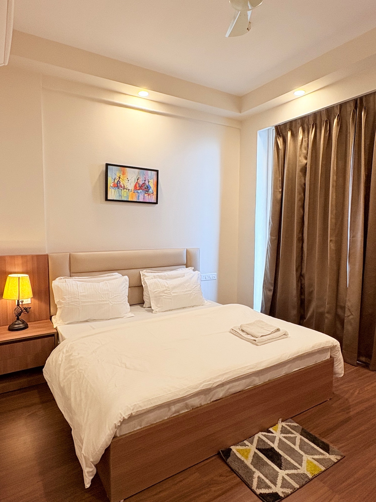Détendez-vous dans ce studio calme et luxueux avec la chaleur de la maison et l'ambiance d'un hôtel haut de gamme. Meublé avec un lit King Size moelleux et un décor moderne. Équipements : Épicerie ouverte 24h/24 Kitchenette moderne WiFi et télévision haut débit Parking sécurisé à l'extérieur de la tour, mais sécurisé 24h/24 Les 2 premiers étages disposent de boutiques commerciales, offrant : Services de blanchisserie Salon Café Magasin médical Accès facile à l'India Expo Mart, circuit international de Bouddh. Parfait pour les couples, les voyageurs en solo ou les partenaires commerciaux.