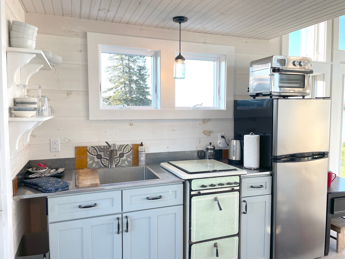 Chalet écologique ensoleillé sur la Route 1, à quelques pas de la plage ! Un studio confortable avec un lit Murphy, une salle de bain complète et une kitchenette - cuisinière, réfrigérateur, grille-pain et micro-ondes. Belle vue sur la baie de Penobscot – ne vous inquiétez pas, les stores garderont le soleil à distance lorsque vous aurez besoin d'une sieste ! Vous êtes à quelques minutes à pied de plages de sable, de restaurants, de boutiques, d'un torréfacteur et d'un marché. Explorez les sentiers de randonnée à proximité, le mont Battie et les charmantes villes de Belfast, Camden, Rockport et Rockland.