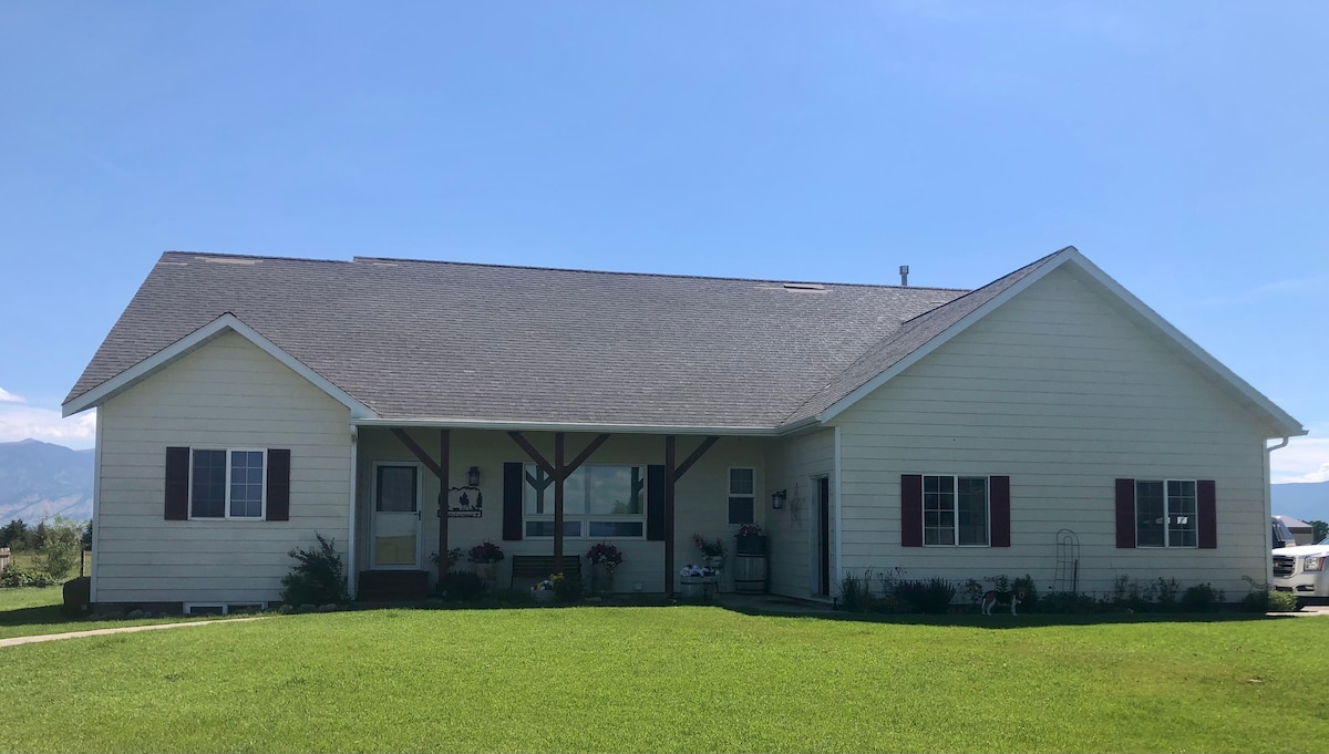 Détendez-vous avec toute la famille dans cet endroit paisible où séjourner. À 33 miles du GRAND CIEL, à 18 miles de BRIDGER BOWL et à 91 miles de YELLOWSTONE PARK. Situé à proximité de l'aéroport. La belle vue sur les montagnes vous permettra de laisser tous vos soucis derrière vous. Beaucoup de jouets pour enfants et un parc pour bébé. Profitez de la vue imprenable sur les montagnes depuis le spa pour 6 personnes. Les gardiens vivent au sous-sol et ont une entrée extérieure séparée. 22 h, heure de calme. On a aussi un chat qui traîne dans la grange. Nous avons des caméras extérieures.