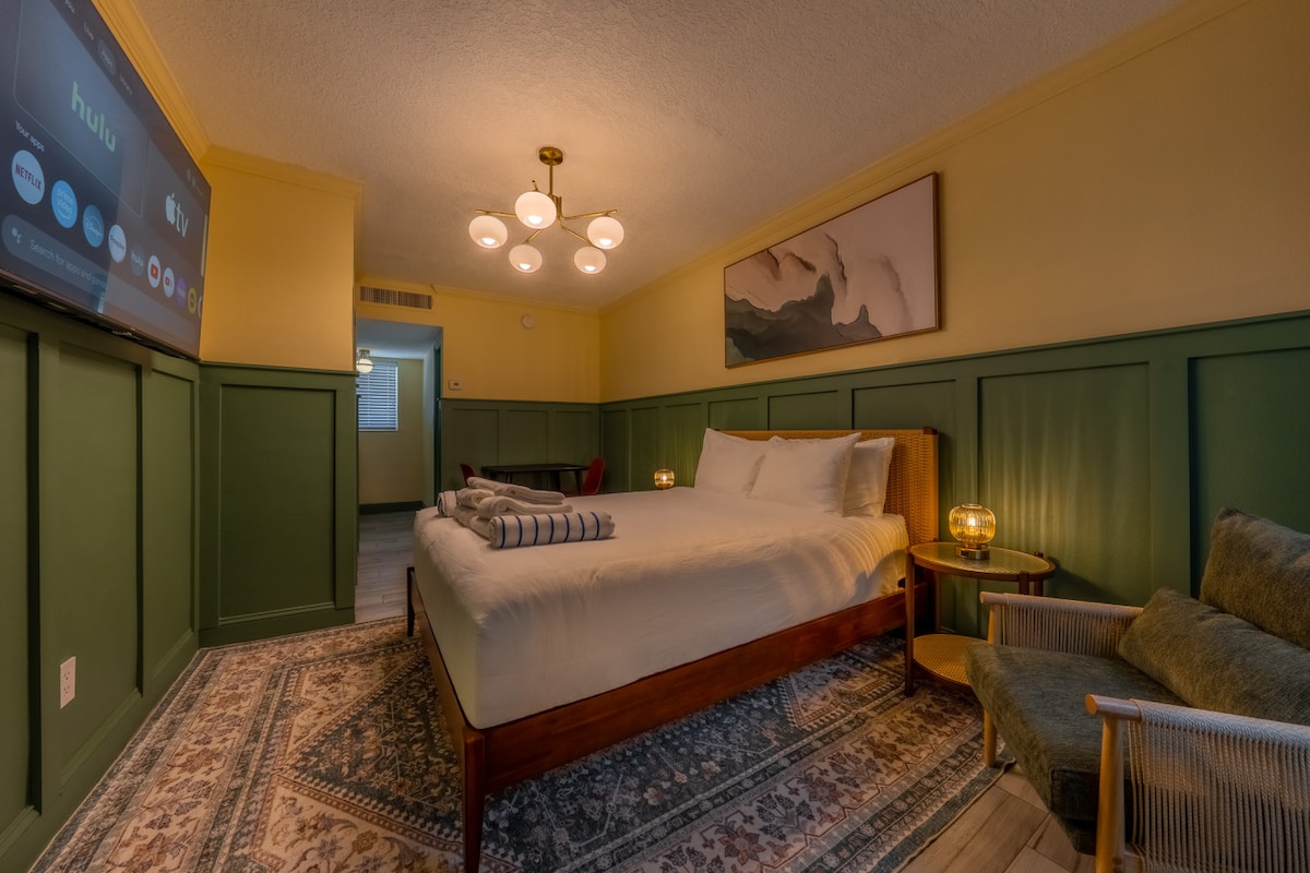 Remontez le temps à Postcard Paradise, un charmant chalet en bord de mer qui capture la magie de la vieille Floride. Nichée à quelques pas du rivage, notre retraite éclectique donne l'impression de vivre à l'intérieur d'une carte postale vintage. Les couleurs ensoleillées et les fresques tropicales donnent une ambiance nostalgique, tandis que le confort moderne permet de garder les choses faciles et détendues. Chaque chambre confortable est remplie de décorations triées sur le volet, de draps aérés et de trouvailles côtières originales, créant un espace unique où chaque coin raconte une histoire.