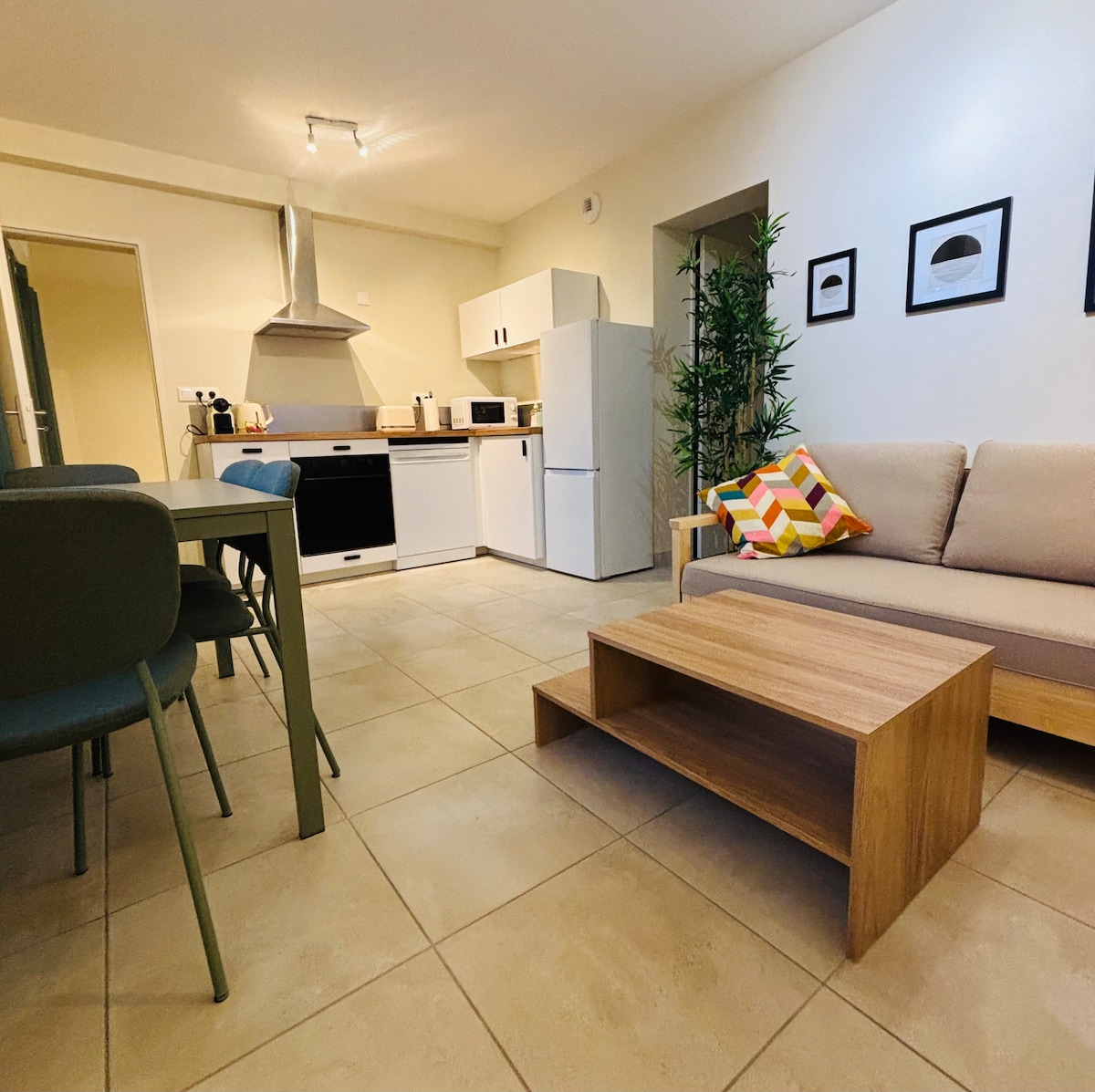 Appartement proche du centre ville rénové tout confort. - 1 chambre lit double avec rangement. - 1 salle de bain avec serviettes et sèche cheveux. - 1 WC séparé. - 1 cuisine équipée ( plaque induction, machine TASSIMO, bouilloire, micro-onde, frigo, machine à laver, vaisselles à disposition ). - 1 salle à manger avec télé, table avec 4 chaises, un canapé convertible en lit pour 2 personnes. - WIFI Fibre. - Linge de maison fourni.