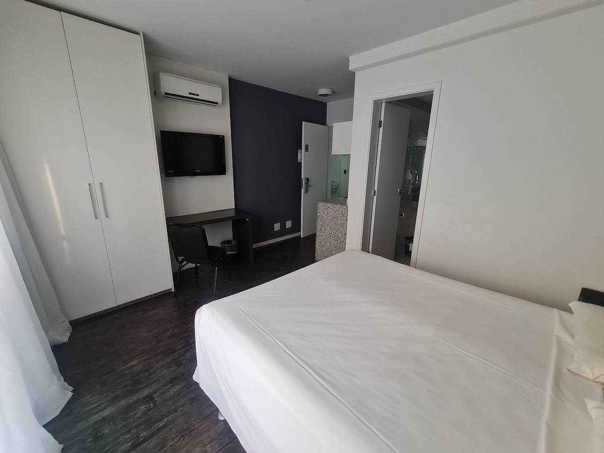 Appartement au rez-de-chaussée de l'Hôtel Flat San Diego Pampulha. Devant Lagoa da Pampulha. Chambre avec minibar, micro-ondes, TV, climatisation, 2 lits simples pouvant être transformés en 1 lit double. Le petit déjeuner peut être loué directement à l'hôtel. Il n'y a pas de changement de serviettes ou de ménage de la chambre à moins que vous ne restiez une semaine. Les couverts sont fournis par le restaurant de l'hôtel pour la consommation. - Pas plus d'un petit animal de compagnie est autorisé. - Il n'y a pas de nettoyage et de changement des serviettes/draps.