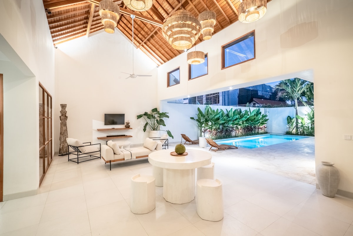 Veuillez consulter nos autres villas et nous contacter à (sukmavillasbali point com) ou IG sukma_villas Cette toute nouvelle villa achevée en 2022 est élégante, confortable et idéalement située à Berawa, Canggu, à proximité du café Satu Satu et de l'action ! Petit déjeuner✔ GRATUIT et ménage inclus 6 jours par semaine. Séjour ✔ ouvert ou fermé avec portes entièrement coulissantes. ✔ Salon avec télévision connectée et barre de son (+ Netflix) Internet ✔ HAUT DÉBIT (100 Mbit/s+) ✔ Climatisation dans TOUTES les chambres.