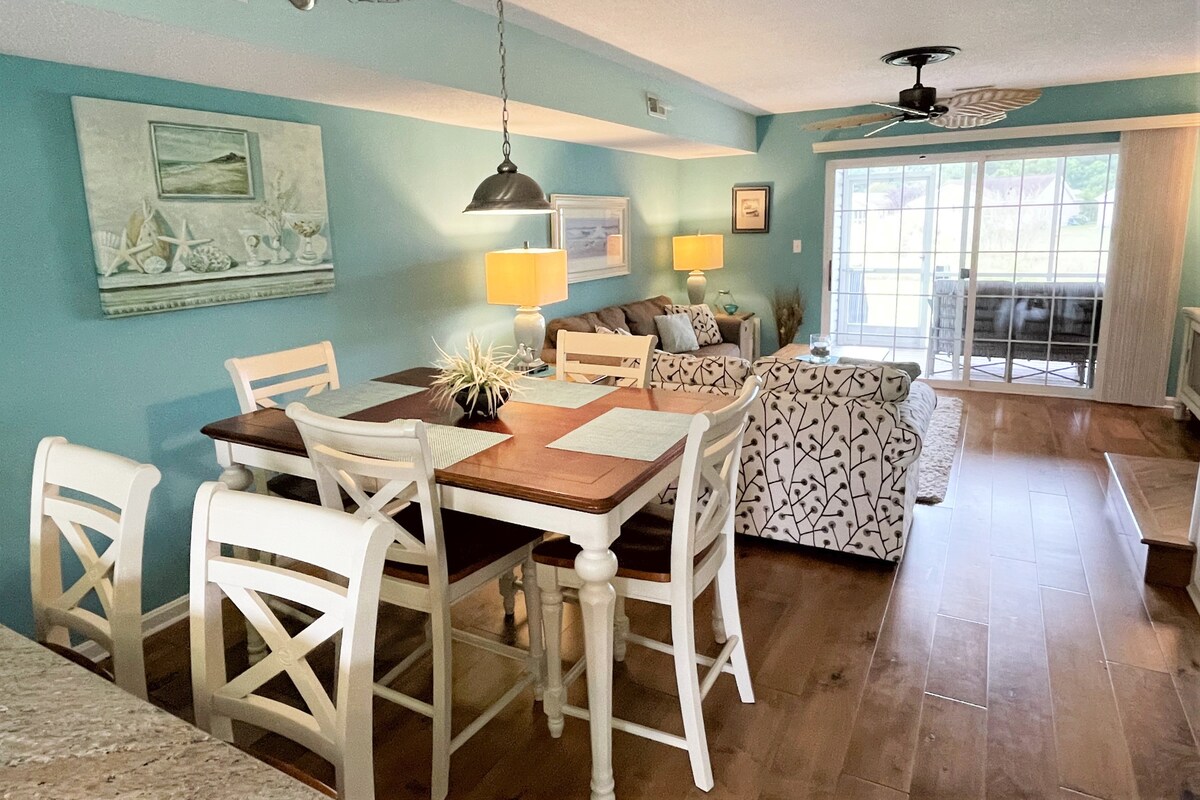 Maison de ville spacieuse et confortable à un pâté de maisons de la plage! Entièrement rénové! Cuisine ouverte, salle à manger et salon avec plafond cathédrale. Le niveau principal a une jolie efficacité privée appelée « The Captains Quarters ». À l'étage, la suite de la chambre à coucher principale dispose d'une terrasse privée, d'une salle de bain privée et de placards doubles avec une télévision intelligente. La deuxième chambre possède un lit Queen, des lits superposés avec un lit gigogne et une salle de bain partagée. Le loft est confortable et frais, avec deux divans-lits gigognes et un lit complet. Les lofts sont idéaux pour les enfants*