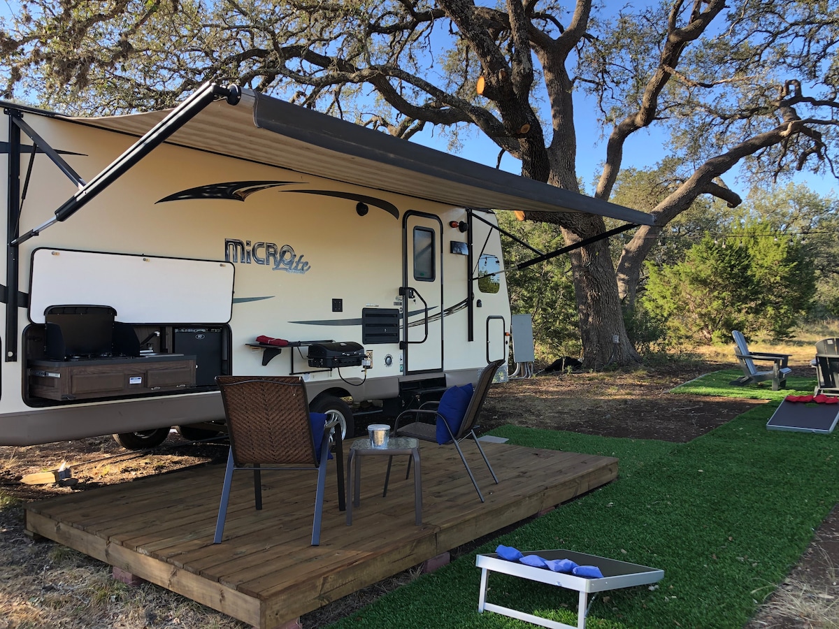 Nouveau camping-car de luxe, avec trois lits et un lit queen size en mezzanine. Au cœur de la région des collines près de Canyon Lake, de la rivière Guadalupe, de la rivière Blanco, de Wine Country, du parc national de Guadalupe et du parc national de Blanco. Il y a beaucoup de place pour toute la famille ou juste une escapade romantique. Super petit bungalow pour les enfants avec une télévision, ainsi qu'une deuxième chambre avec télévision et un canapé, un espace extérieur pour le divertissement avec télévision et son stéréo surround. Il y a tellement de choses que ce camping-car de luxe a à offrir. 5 téléviseurs au total.