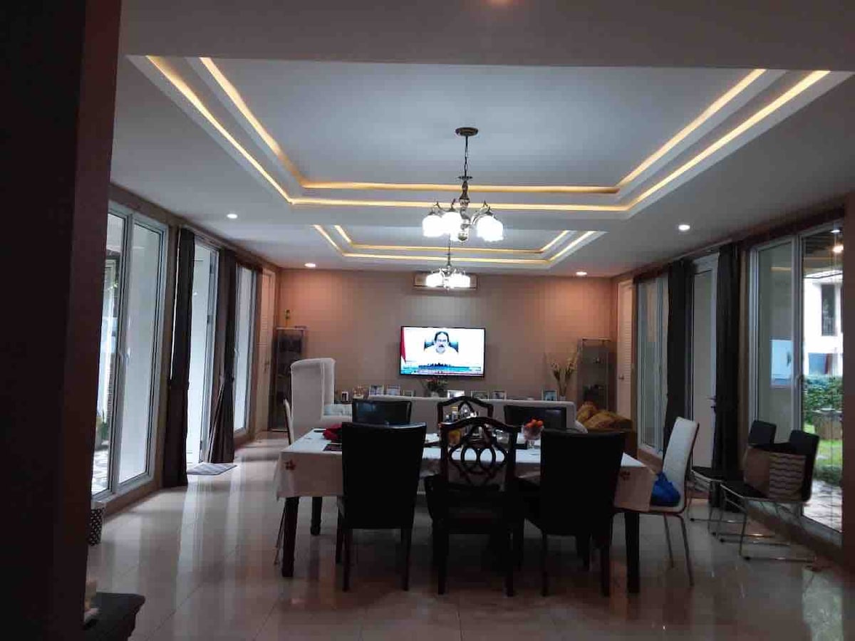 Détendez-vous en famille dans ce logement tranquille à Komplek Danau Bogor Raya (Bogor Lakeside). Notre villa de 3 chambres peut accueillir 8 personnes ou plus (avec un lit d'appoint). La table à manger peut accueillir 12 personnes. Nous avons un ping-pong et une télévision Android de 65 pouces pour regarder des films avec votre grande famille. Vous pouvez occuper vos enfants avec beaucoup de jouets, un cadre d'escalade et des balançoires. Rumah di dalam kompleks, bisa diakses dr exit toll Kebun Raya dan Summarecon , 1 km dr Novotel Bogor dan Golf Course Bogor Raya.