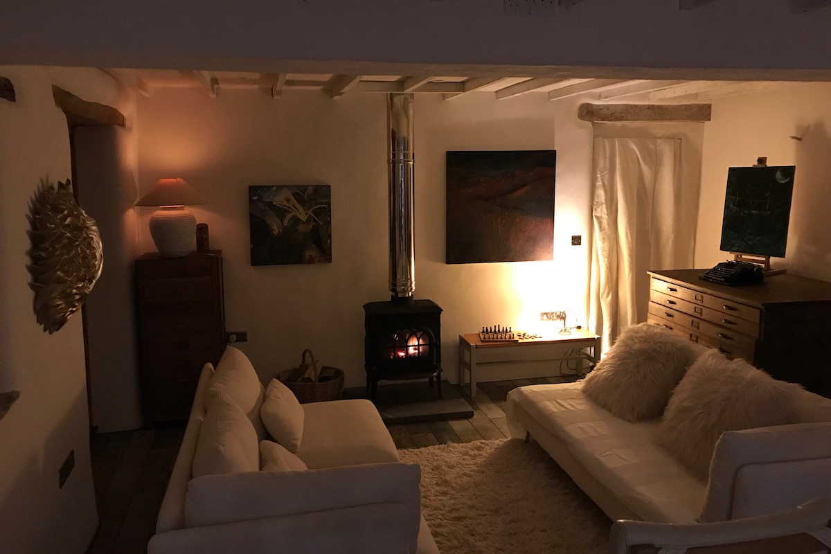 Espace créatif avec véranda de jardin + poêle à bois. Spacieux, artistique, le studio dispose d'une vaste bibliothèque + poêle à bois pour des soirées confortables. *Pas de télévision* Jolie chambre spacieuse et lumineuse avec salle de bains et poutres. La propriété est neutre en carbone : le chauffage au sol, le chanvre et la chaux isolent les murs. Les peintures à l'argile naturelle donnent à l'endroit une atmosphère chaleureuse et organique. Nous avons rénové avec amour la grange d'un délabré au cours des 15 dernières années et nous aimons accueillir les voyageurs. Yourte Wolf Moon disponible pour des personnes supplémentaires.