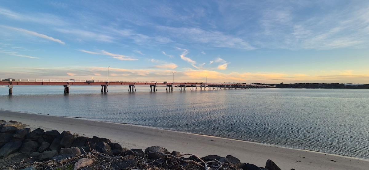 Détendez-vous sur la plage en famille dans cette maison paisible et amusante loin de chez vous. Profitez de la vue sur l'eau depuis la chambre principale et la terrasse tout en vous connectant à la nature et en vous décompressant à un peu plus d'une heure du CBD de Brisbane. Plage sûre et abritée juste en face, idéale pour les enfants et les longues promenades. Promenade facile de 10 minutes le long de la piste cyclable en bord de mer jusqu'au club de surf et au pub de Woorim, aux cafés locaux/fish and chips. Profitez de cette partie calme et isolée du Queensland, connue pour l'observation des oiseaux, les dauphins et les plages calmes.