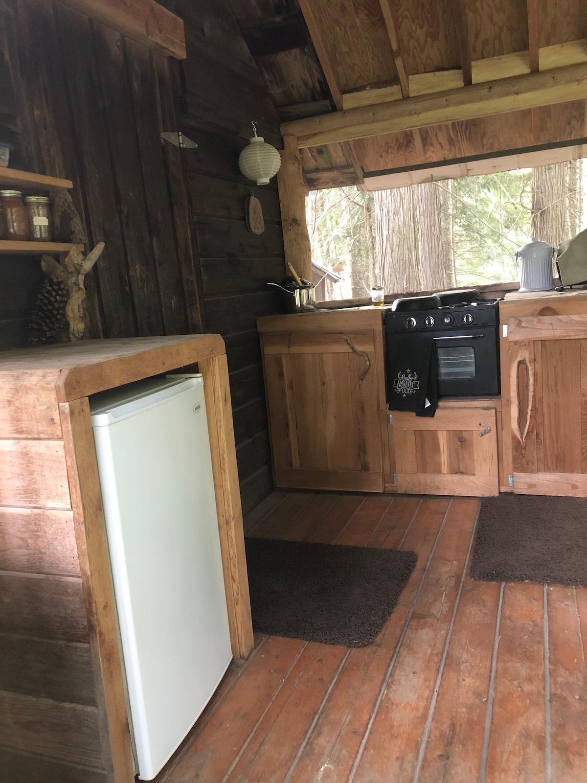 Nichée entre d'énormes cèdres, notre petite cabane dispose d'une salle de bain et d'une douche, ainsi que d'une cuisine extérieure. Un futon pour deux pour se détendre pendant les mois d'hiver ou pour se détendre pendant les nuits d'été fraîches. Notre cabane est située à côté de notre jardin biologique et de nos vergers. Au-dessus de l'étang avec balançoire à corde et tyrolienne, cette retraite entre Spokane et le parc national des Glaciers est un endroit idéal pour se reposer.