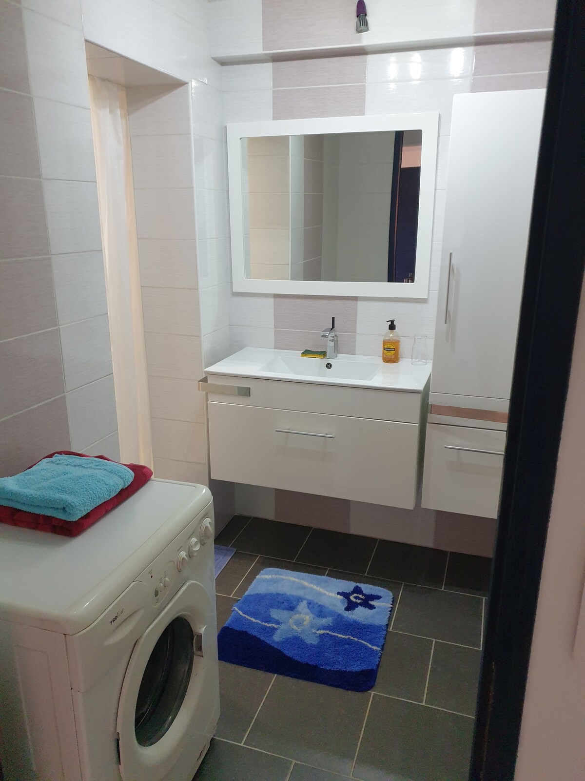 Logement meublé de 55 m², se compose : -d' une cuisine entièrement équipée (plaque de cuisson, four, micro ondes, réfrigérateur, hotte, cafetière dolce gusto, vaisselle, aspirateur...) ; -un salon/séjour : canapé/lit, table basse, TV, table de salon et chaises ; -une salle de bains avec machine à laver, 1 meuble vasque, douche ; -une chambre avec lit, bureau et placards, -et un WC. Emplacement de stationnement clos, un extérieur : pelouse Les draps et serviettes de toilettes sont fournis.