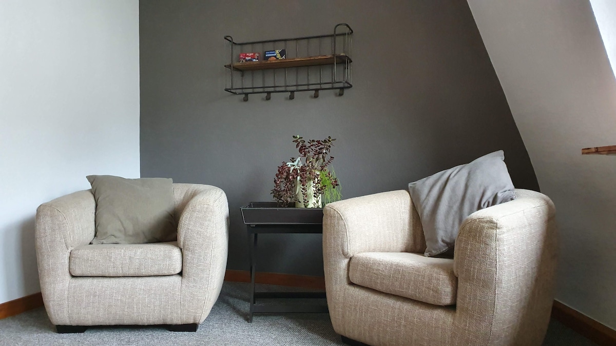 Nous louons notre petite chambre d'hôtes (... c'est UNE chambre, même si airbnb indique séparément le salon et la chambre à coucher sur les photos) avec salle de bain et entrée privées. La chambre dispose d'un lit de 80x200 cm qui peut être rapidement élargi à 160x200 cm. La chambre a « seulement » environ 13 mètres carrés (plus salle de bain), mais tout ce dont vous avez besoin pour un court séjour : une armoire, 2 chaises, une table, un réfrigérateur, la possibilité de faire du café et du thé... tasses, assiettes, couverts ...