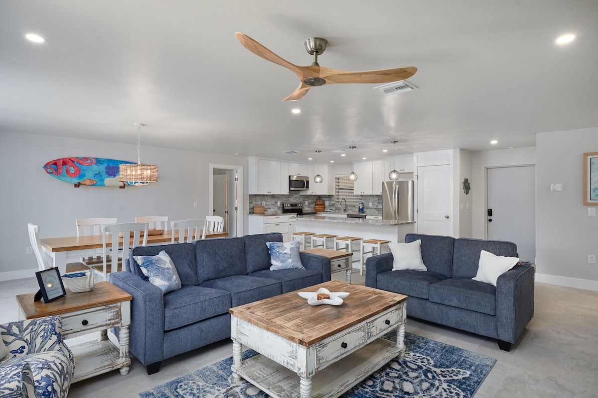 Belle maison moderne de NOUVELLE construction avec piscine chauffée, sur le canal d'eau salée. Sans dommage après l'ouragan Milton. AMUSANTE pour les familles et tranquille pour les adultes ; entièrement équipée avec table de jeux électroniques, jouets et flotteurs de piscine, jeux d'extérieur, jeux d'arcade, jeux de société — beaucoup à apprécier ! Profitez de la vie intérieure/extérieure sur une grande véranda de style resort et retirez-vous dans des finitions élégantes et des équipements de luxe partout !