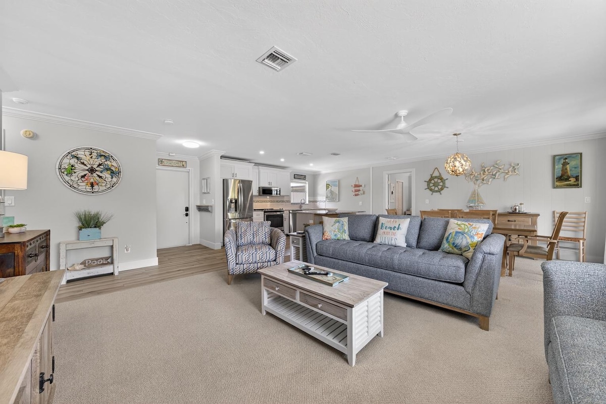 Directement sur la plage sans escaliers à monter! Profitez du rez-de-chaussée à son meilleur dans cette retraite côtière relaxante, à quelques pas de la plage. Ce grand condo d'une chambre peut accueillir 5 personnes et a été entièrement rénové pour inclure une cuisine et une salle de bain personnalisées avec une grande douche à l'italienne. Mobilier côtier haut de gamme dans chaque pièce. La chambre principale spacieuse offre un lit king size Stearns and Foster et un bureau pleine grandeur si vous avez besoin d'un espace calme pour travailler. Le Wi-Fi a été entièrement mis à niveau pour faciliter le streaming et la vidéo!