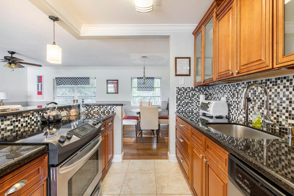 wow ! ! condo au 1er étage au bord de l'eau, niché dans la charmante ville de Lantana, à 20 minutes à pied de la plage. à quelques minutes de la HIP Lake Avenue et de l'Atlantic Avenue. 2 chambres (lit king size MB), 2 salles de bain complètes, cuisine entièrement chargée prête pour cuisiner et se divertir. bateau/quai de pêche partagé - apportez votre bateau ou votre loyer. Nous possédons 2 autres logements dans l'immeuble si vous souhaitez arriver avec d'autres familles. Nous sommes fiers de notre hospitalité ; nous ferons de notre mieux pour rendre vos vacances/voyage géniaux . 1 animal accepté🫶