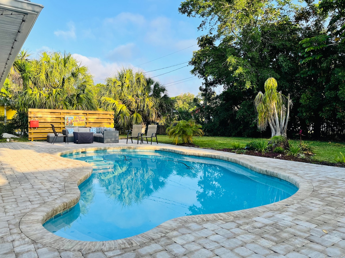 Maison de luxe haut de gamme avec piscine 3/2 ! 7 téléviseurs 4K avec Netflix et câble (75" dans le séjour), SONOS dans toute la maison et la piscine, Wi-Fi, PS5, piscine privée chauffée d'eau salée/spa, putt putt, baby-foot, équipement de plage, Pack & Play, salle de jeux (jeux de société, billard, jeu de palets, arcade), cuisine/bar massif, lave-linge et sèche-linge, parking dans le garage, le tout dans un quartier calme et sûr. À seulement 5 miles des meilleures plages et restaurants. Logement entier sans équipements partagés !