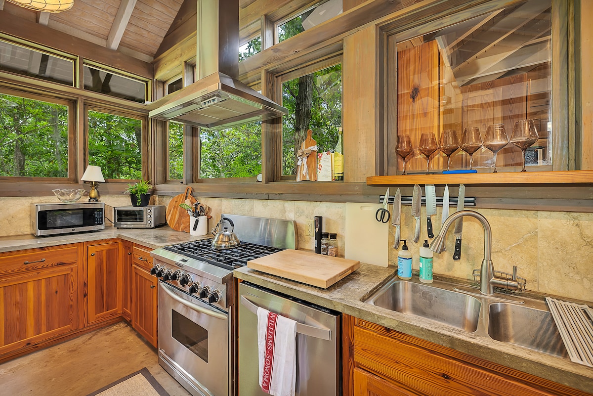 Cette pittoresque ferme des années 1960 se trouve à côté d'un magnifique vieux magnolia. Il y a une cuisine complète et une salle à manger à côté d'un salon confortable avec wi-fi, une télévision et un tourne-disque. La chambre principale a un lit king size avec une demi-salle de bain. La deuxième chambre dispose d'un lit Queen Size. Salle DE bain complète avec baignoire et douche. Le salon a un foyer et un canapé-lit. Le point culminant de cette maison est le grand porche vitré donnant sur le pâturage de vaches.