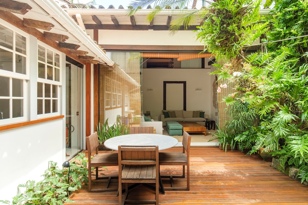 Magnifique maison dans le centre historique de Paraty, 3 suites spacieuses pouvant accueillir jusqu'à 8 personnes, beau jardin d'hiver avec mini piscine, cuisine entièrement équipée, lave et seche linge, service de ménage quotidien inclus. Wifi fibre optique haut débit (adapté teletravail). Climatisation dans toutes les pieces. Le tarif comprend un petit déjeuner gourmand servi dans la salle principale ou dans le jardin.