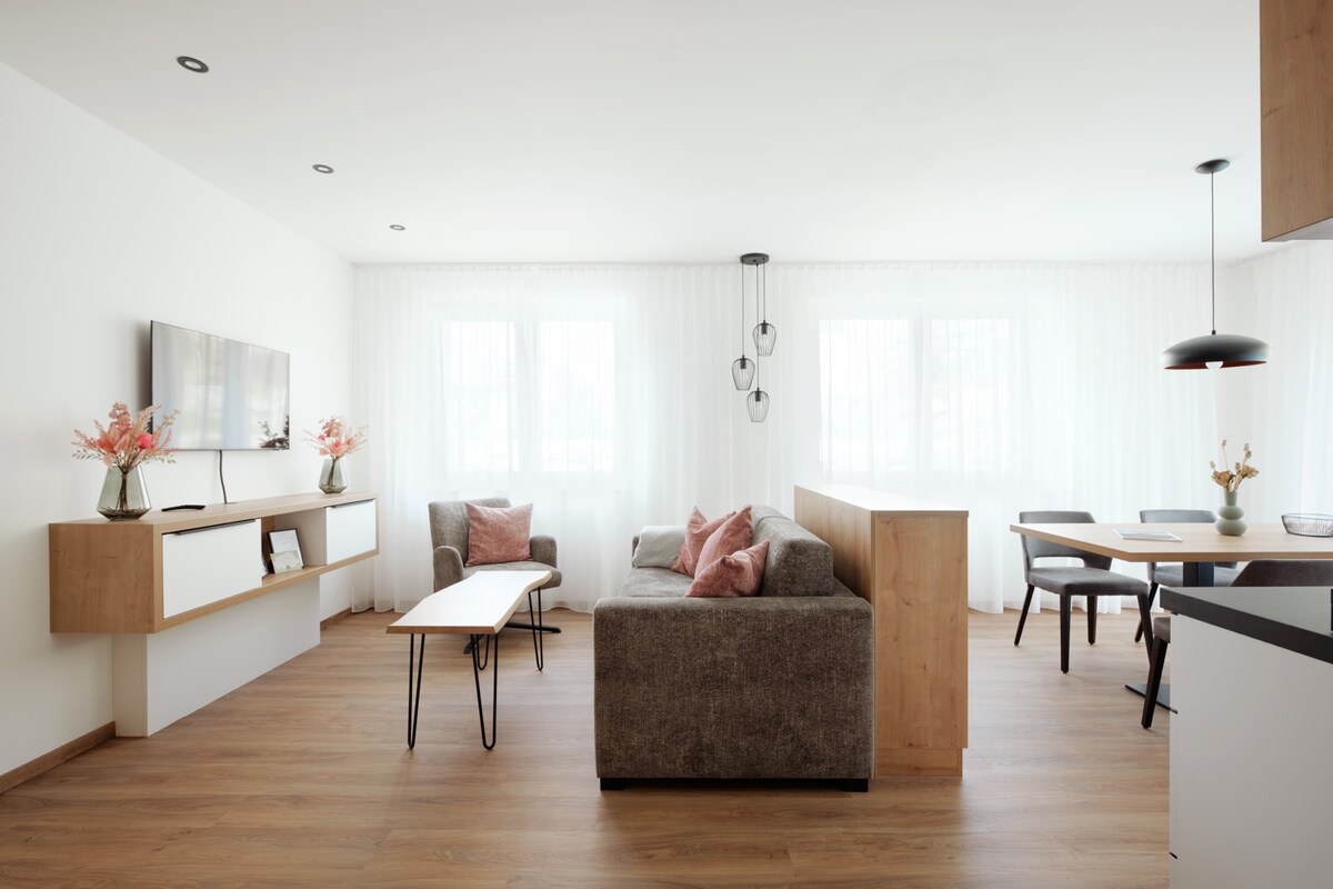 110 m2 d'ambiance de bien-être pour 6-7 personnes. Beaucoup de bois naturel sur les murs et le sol avec chauffage au sol. Composé d'un salon-cuisine et d'un coin repas, d'un canapé-lit dans le salon pour 1 personne, de 2 téléviseurs, d'une chaîne stéréo BOSE, de 3 chambres avec lits doubles, d'une grande salle de bains avec baignoire, douche, double lavabo ainsi que d'une sortie sur le balcon et d'une vue sur les montagnes. Une salle de bain avec douche, 2 WC séparés, grand balcon orienté plein sud et WLAN. Parking souterrain avec e-mobilité et ascenseur jusqu'à l'appartement.