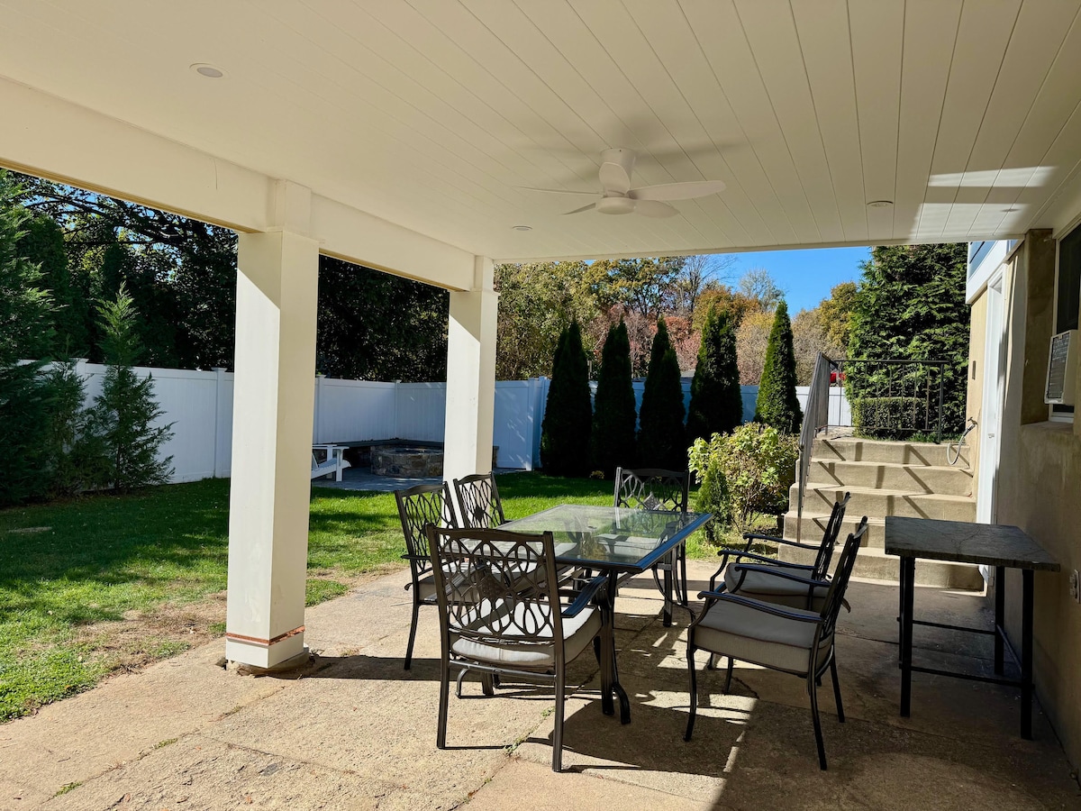 Appartement confortable de deux chambres dans une rue calme de Greenwich avec des appareils électroménagers neufs. À distance de marche de la gare de Metro North, de la plage, du parc, du terrain de tennis, du terrain de pickle ball, des restaurants et des magasins. À seulement 38 minutes de New York. À quelques minutes en voiture du centre-ville. Cuisine entièrement approvisionnée et buanderie avec tout ce dont vous pourriez avoir besoin. Séjour avec télévision connectée de 65". Chambre principale avec télévision connectée de 45 pouces. L'appartement est nettoyé et désinfecté par des professionnels selon les directives du CDC et inspecté avant chaque séjour.