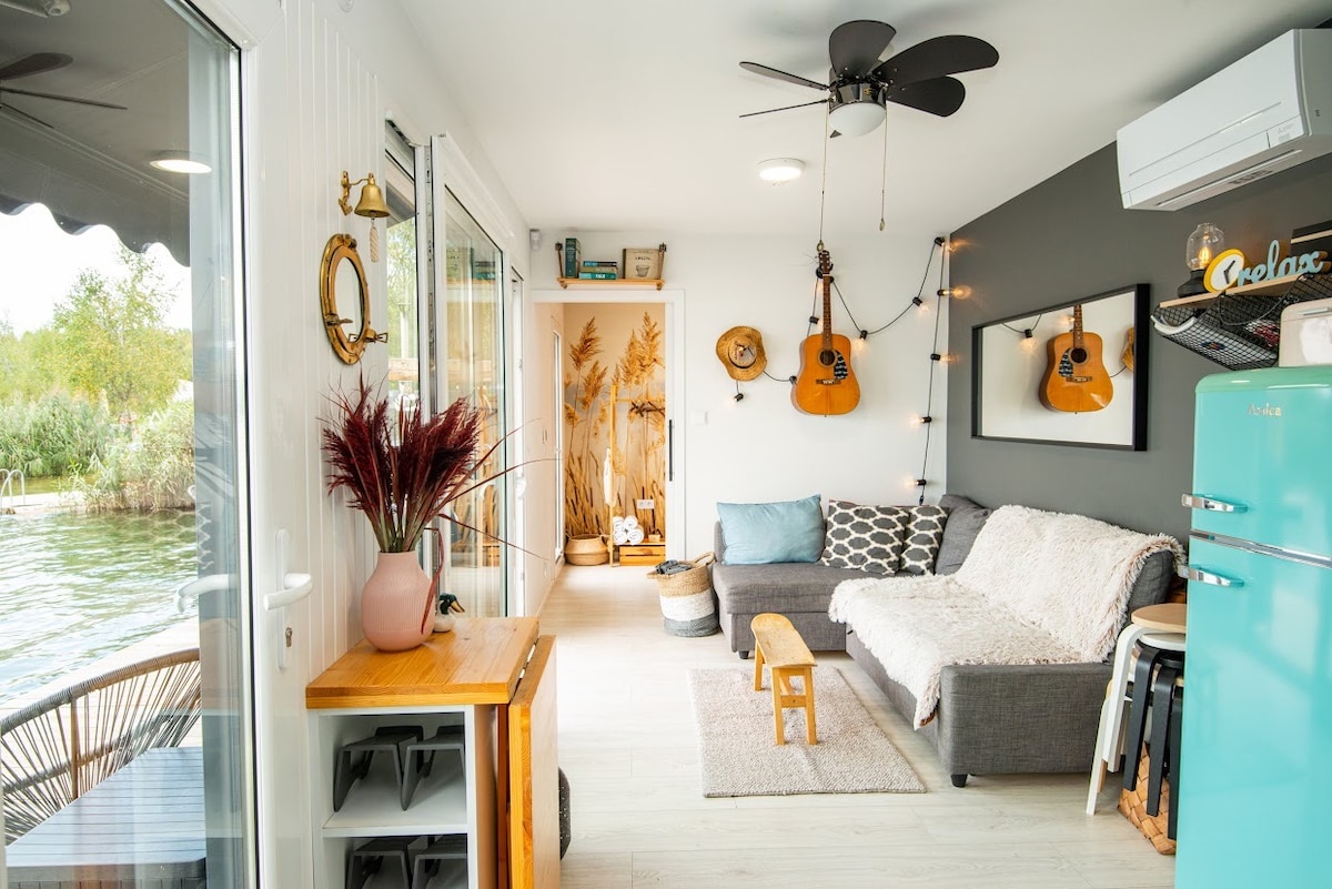 Vivez sur l'eau ! Notre maison flottante est un rêve d'être à proximité immédiate de l'eau. Nous aimerions également partager ce projet extraordinaire avec vous, votre famille et vos amis. Sur une plate-forme flottante de 65 m2, nous avons construit une maison de 35 m² + une terrasse de 30 m ² + une plate-forme SPA de 25 m ², ce qui nous donne au total 90 m² flottant sur l'eau d'une surface utilisable privée. La maison est confortable, chaleureuse, sûre et toute l'année.