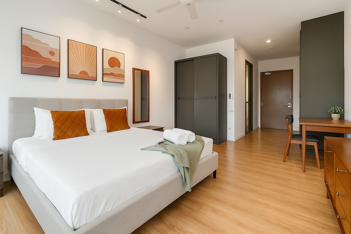 King Suite Home est un appartement de 1 chambre comprenant une cuisine complète avec réfrigérateur et micro-ondes. Il s'agit d'une suite familiale avec des chambres séparées, un salon et un coin repas. Wifi illimité gratuit, télévision, fer et planche à repasser, sèche-cheveux, lave-linge et sèche-linge. Cette King Suite Home est un appartement AIRBNB convivial et accessible pour profiter de nombreux appartements en résidence. Salon confortable, dans le style équipé d'un joli canapé-lit et d'une table basse. Chambre séparée avec lit Queen Size et table à manger 4 places.