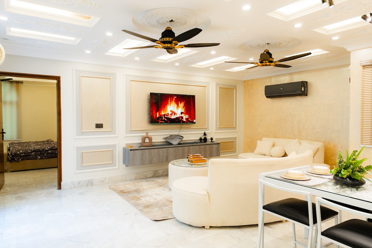 Bienvenue à The Shade House près de DHA Phase 5/6 — une escapade luxueuse de 3 chambres conçue pour les familles et les groupes. Profitez d'un éclairage d'ambiance époustouflant, d'une ambiance chaleureuse et de meubles modernes avec des lits en tissu bouclé haut de gamme. Avec 3 lits king-size (2 à l'étage, 1 au rez-de-chaussée), il accueille confortablement 6 voyageurs. Les caractéristiques comprennent une télévision à DEL de 65 po, une table de billard esthétique, la climatisation et un stationnement sur place. Une retraite parfaite pour ceux qui recherchent le confort, le style et un séjour haut de gamme à proximité des meilleurs endroits de DHA.