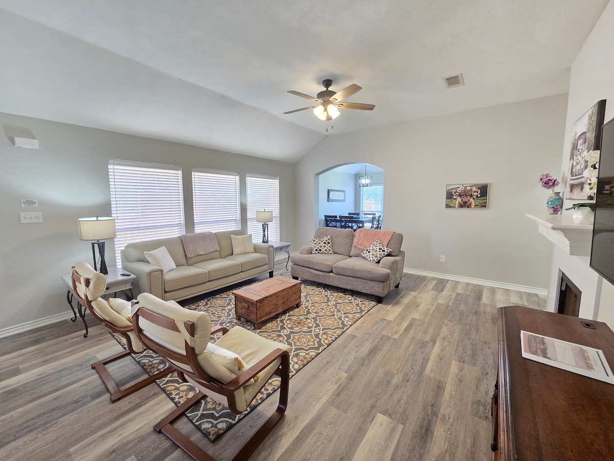 Récemment rénovée, spacieuse et lumineuse ! Cette maison familiale est située à 3 miles du campus et sur la ligne de bus 34 (FISH CAMP). Tout nouveau mobilier et matelas ! Parfait pour les familles avec des équipements pour les enfants (lits superposés, ping-pong, basket-ball, chaise haute, parc pour bébé, etc.) Grande cour arrière avec patio et barbecue. Grand parking et garage. À quelques minutes de l'épicerie H-E-B, de charmants parcs familiaux et de pistes cyclables, d'une grande sélection de restaurants et de Santa's Wonderland ! **Politique stricte d'interdiction des animaux de compagnie**