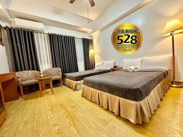 Deluxe Double room for 4 pax: - 2 double sized beds - 43" Cable TV - toilet with hot and cold shower, hair dryer and ring light mirror - one electric fan ( no Aircon ) -Free Wifi & Parking - small fridge cooler, coffee mugs and electric kettle - spacious, well ventilated and a good window garden view ** Kitchen and dining area unit available for your group's exclusive use for an additional charge payable upon check-in. * Walking distance to Burnham Park , night market, and public market.
