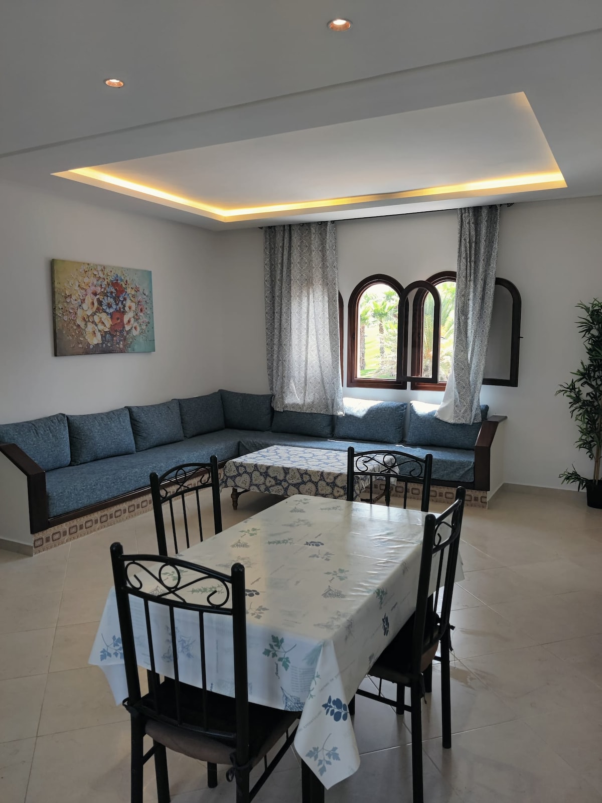 Je met en location un charmant appartement dans un complexe touristique BELLA VISTA à CABO NEGRO. Complexe sécurisé avec 14 piscines, Espace de jeux pour enfants, terrain de sport, supérette, Parking gratuit sur place, Plage à 8 min à pied, wifi . .. Appartement au RDC de 60 mètres carrés composé d'un salon, chambre à coucher, cuisine entièrement équipée, terrasse qui donne sur le jardin, climatisation centralisée, parabole collectif,... complexe réservé uniquement aux familles et couples marié