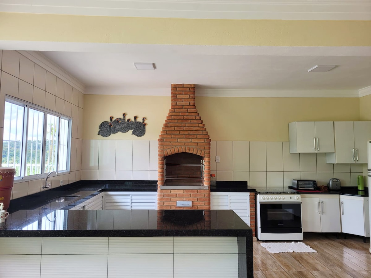 Chácara situé à 90 km de la capitale de São Paulo, idéal pour accueillir une famille. Nous ne réservons pas pour les fêtes. 2 chambres (1 lit double, 2 lits simples et 1 matelas supplémentaire dans chaque chambre) avec seulement la climatisation FROIDE. Chambre spacieuse et confortable. Cuisine avec cuisinière , réfrigérateur, four à micro-ondes et articles ménagers. Gril, congélateur. La piscine N'EST PAS CHAUFFÉE et mesure 2,60 m X 12,00 m. Salle de jeux avec billard , fobolim et carteado. Zone de feu de camp avec vue magnifique !