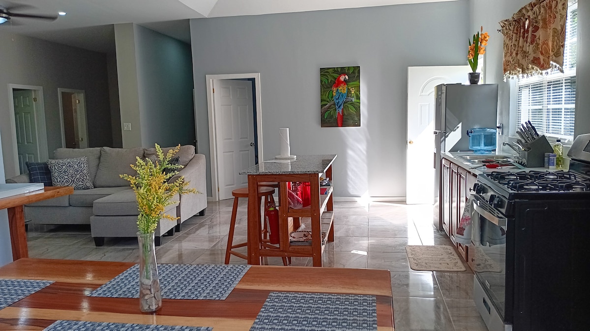 Accrédité par l'Office du tourisme du Belize et Gold Standard Practices. Cette maison contemporaine unique et privée se trouve au sommet d'une colline de trois acres avec une vue magnifique et une piscine privée, deux grandes chambres et une petite, deux salles de bains, un jardin intérieur et trois grandes terrasses. Jardin en terrasse avec des fleurs et des sentiers en pierre pour l'observation des oiseaux. Idéale pour les familles, les amis ou les couples qui souhaitent être proches de la ville mais se sentir loin.