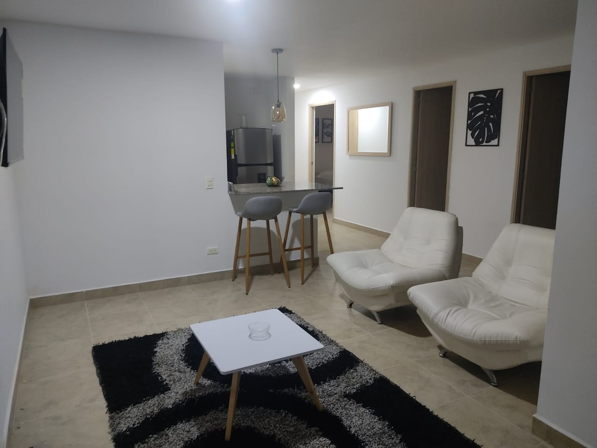 Appartement moderne et confortable à Sabaneta, situé au troisième étage d'un immeuble calme (accès par des escaliers confortables). À quelques pas du parc principal et à 5 minutes à pied de la station de métro Sabaneta et de l'étoile, il dispose de 2 chambres (lit Queen et lit double), salon avec canapé-lit, 1 salle de bain avec eau chaude, TV, wifi, salle à manger et cuisine intégrale entièrement équipée. Profitez de 2 balcons avec un éclairage et une ventilation naturels.