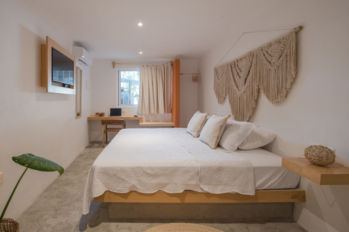 Suite principale en bord de mer avec une grande fenêtre. Un espace paisible, parfait pour la détente ou le travail à distance avec une connexion Internet ultra-rapide (plus de 150 Mbit/s). Le design d'intérieur artisanal par des artisans mexicains crée une atmosphère authentique et chaleureuse. Profitez de matelas en mousse à mémoire de forme et de draps 100 % coton pour un confort maximal. À seulement 25 minutes de l'aéroport et à 10 à 15 minutes du centre-ville de Cancún. Entouré de végétation tropicale, de levers de soleil sur l'océan, de palmiers, de ciels étoilés, d'étoiles filantes, de pélicans et de flamants roses.