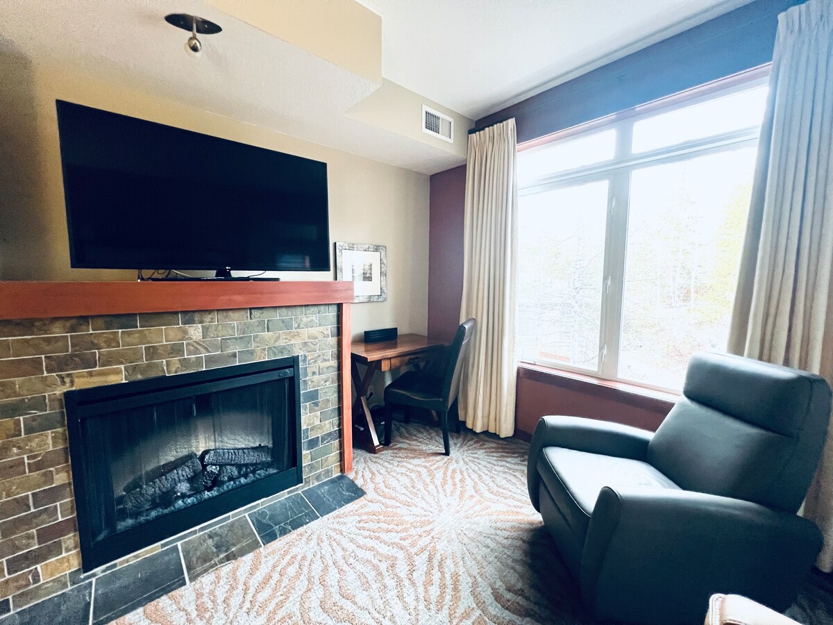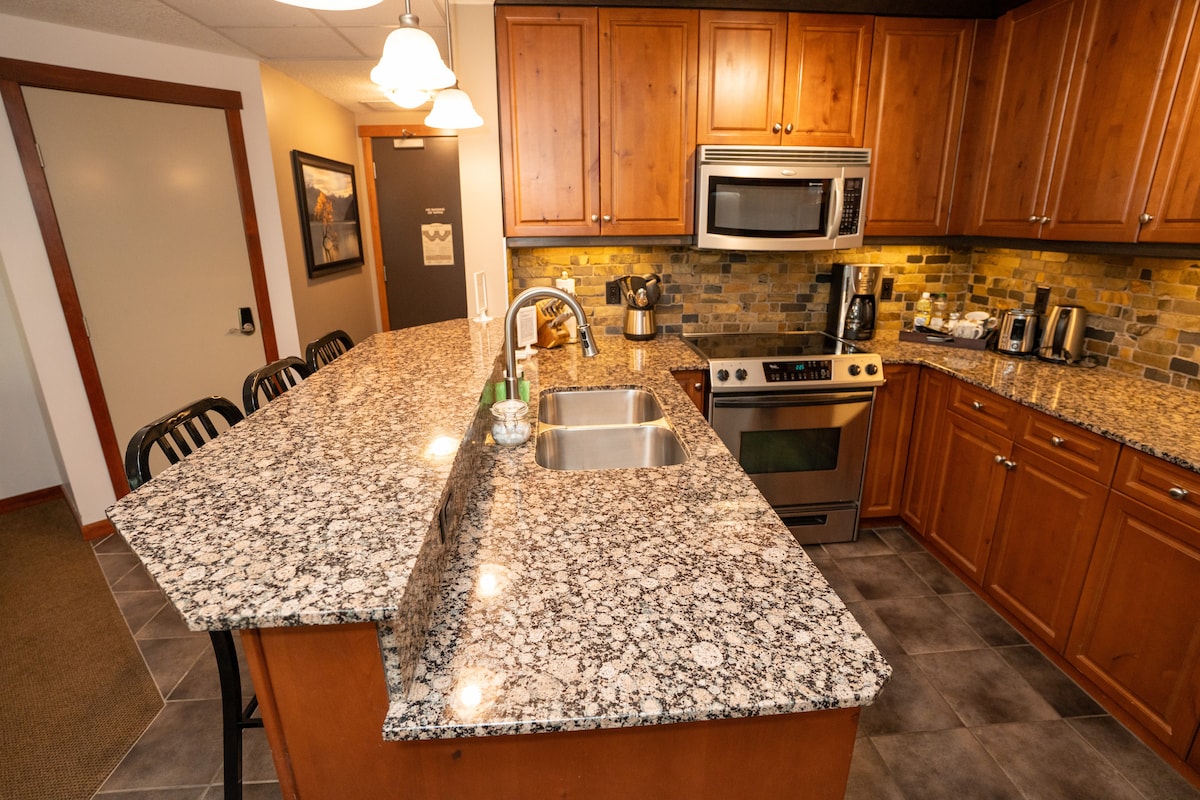 Bienvenue dans votre luxueuse retraite de montagne ! Cette toute nouvelle suite king size d'une chambre peut accueillir jusqu'à 4 voyageurs. À seulement 10 minutes à pied du centre-ville, la suite dispose d'un lit king size, d'un canapé-lit gigogne, d'une salle de bain, d'une cuisine moderne entièrement équipée, d'une télévision à écran plat, d'un lave-linge/sèche-linge, de draps et de serviettes de luxe. La suite comprend un accès à un jacuzzi, une salle de sport et une place de parking souterrain. Permis de location courte durée : RES-09776