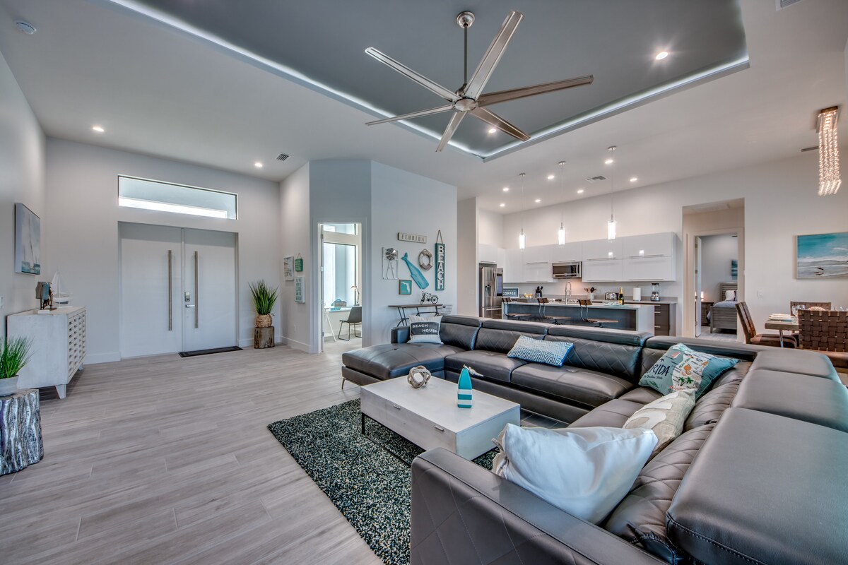 Évadez-vous dans cette retraite moderne de 4 chambres/3,5 salles de bain avec accès au golfe, piscine chauffée, spa et lanai à l'étage pour une vue imprenable sur le coucher du soleil. Profitez d'une table de billard, de ping-pong, de cornhole, de vélos et de cannes à pêche. Faites un barbecue et mangez dehors, ou détendez-vous sous le Tiki Hut au bord de l'eau. Parfaite pour les familles et les amis, cette maison offre le mélange idéal de luxe, de plaisir et de vie inoubliable au bord de l'eau.