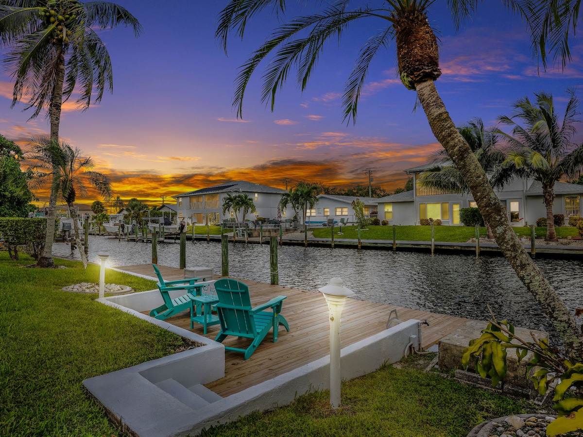 Bienvenue à Sprocket Boathouse, votre escapade privée au bord de l'eau adaptée aux animaux de compagnie sur l'un des canaux les plus larges de Cape Coral. Admirez les couchers de soleil incroyables depuis la piscine chauffée, pagayez sur les canaux sur des kayaks gratuits ou pêchez directement depuis votre propre quai. Commencez votre matinée en apercevant des tortues, des iguanes et des hérons le long de l'eau. Passez la journée à flotter sous le soleil, puis détendez-vous avec des cocktails et un barbecue alors que le ciel devient rose sur le canal.