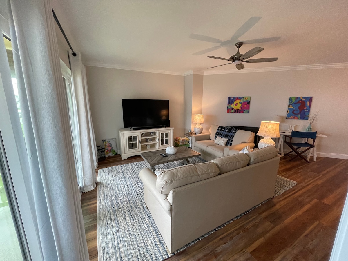 - Voiturette de golf LSV 4 places GRATUITE (la couleur et la marque peuvent varier) - Accès à la plage à 5 minutes à pied ; - Piscine communautaire et jacuzzi - Cuisine entièrement approvisionnée ; - Animaux acceptés moyennant des frais, pas de chats. - Peut accueillir jusqu'à 4 adultes maximum en lits king size et queen size ; - Espace superposé pour 2 enfants - Serviettes de plage et équipement - Vue sur le canal et les quais pédestres entourant la propriété - Balcon avec chaises Adirondack et table - 3 téléviseurs intelligents, un haut-parleur de barre de son son.
