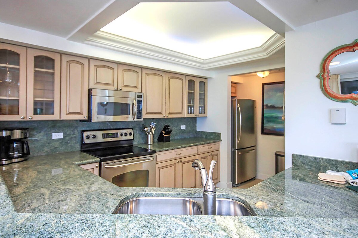 Ce logement en bord de mer vient d'être rénové du haut en bas. Chaque centimètre carré, des sols aux portes donnant sur les meubles, les appareils électroménagers et le matelas Prana Sleep à 5 000 $ US ! La vue sur l'océan depuis cette unité est magnifique. Comprend votre propre voiture de golf privée ! Ce magnifique logement en bord de mer est situé dans le complexe hôtelier de South Seas.