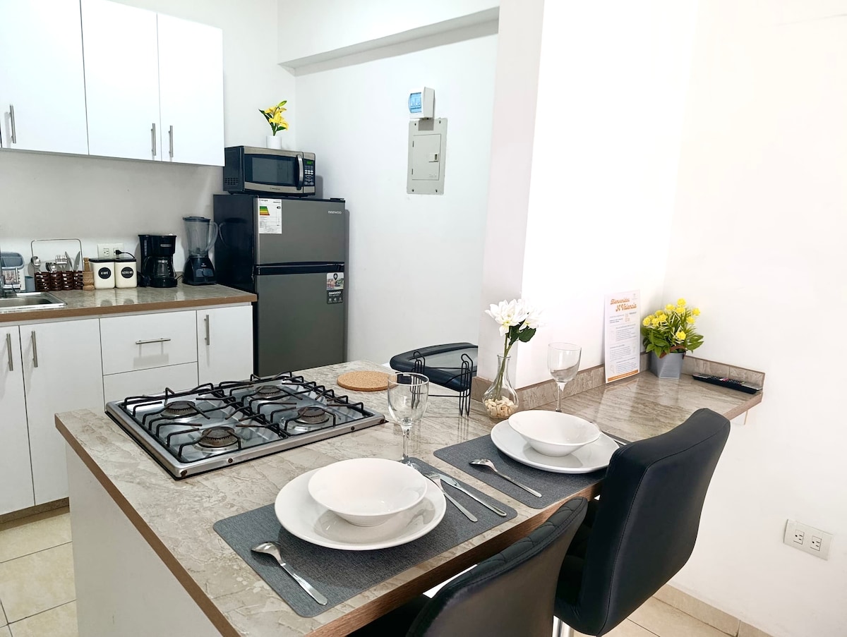 Profitez d'un séjour parfait dans cet appartement confortable pour 2 personnes, conçu pour vous offrir confort et tranquillité au cœur de la ville ! Il dispose d'une cuisine équipée, d'un lit queen, d'une télévision intelligente, d'une connexion Wi-Fi, de la climatisation, d'une salle de bain moderne et de toutes les commodités dont vous avez besoin. Situé dans un quartier central, vous aurez à proximité des marchés, des pharmacies, des boulangeries et un centre commercial.