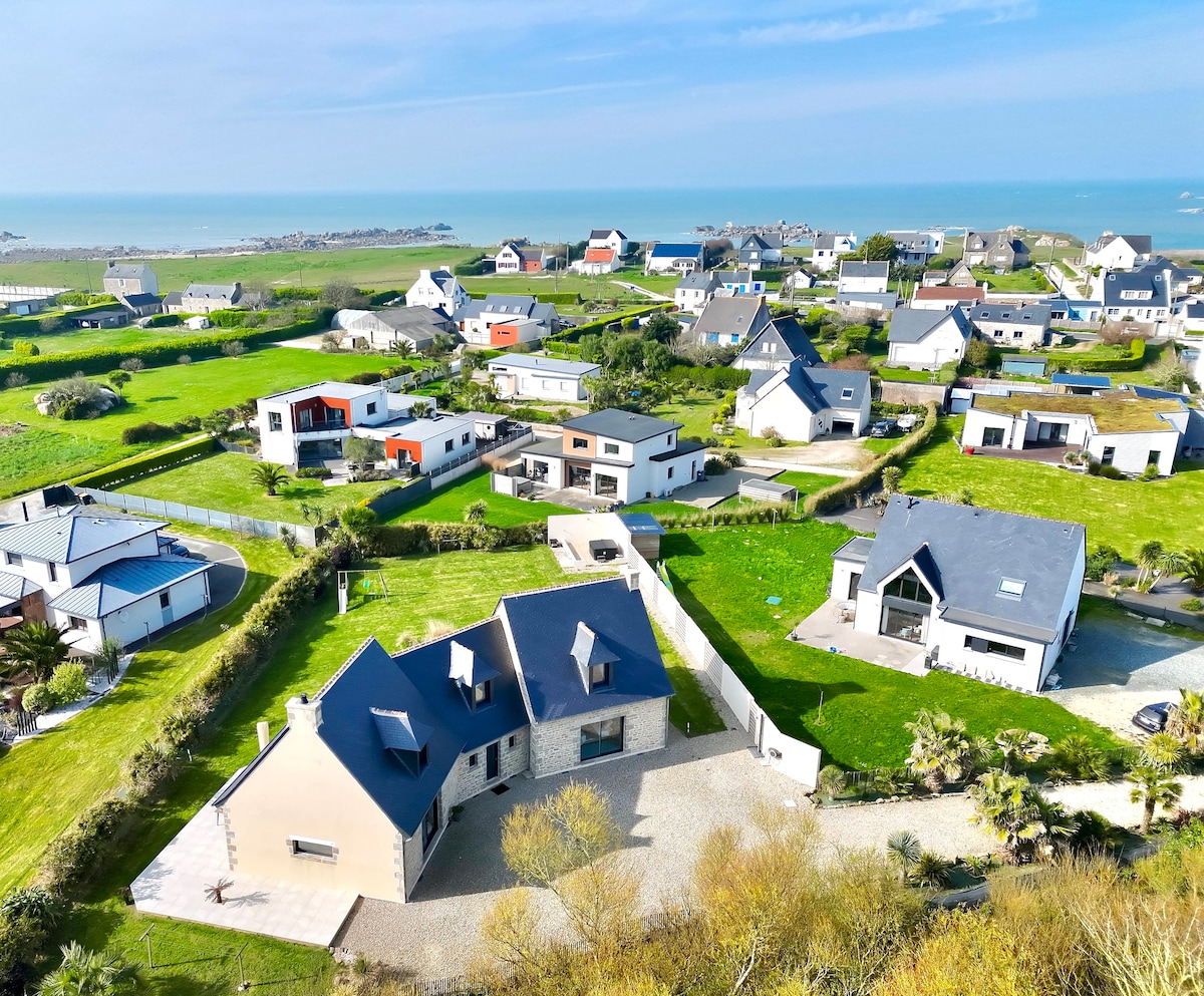 Villa Néo-Bretonne classée 4 étoiles à 250 mètres des plus belles plages du Finistère Nord. Sable fin et eaux turquoise! À deux pas : sentier de randonnée ( GR 34). Marché local le dimanche matin en période estivale sur la place du port à 2 min à pieds. Le village est idéalement situé pour visiter le Finistère nord entre Roscoff et Saint pol de Léon . Jacuzzi extérieur disponible toute l'année et un sauna pour 4 personnes. Venez vous ressourcer et profitez des magnifiques paysages !